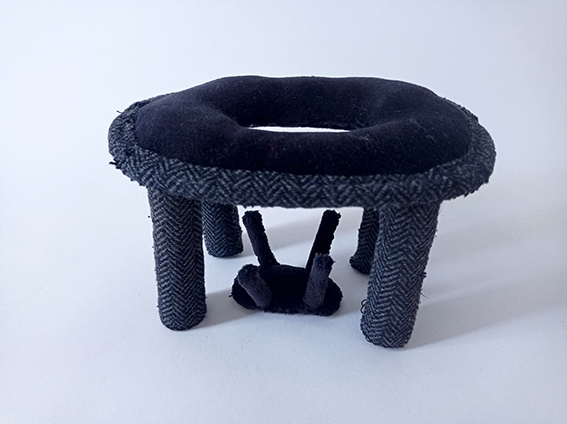 Roupas velhas, varas de madeira, cartão, palha, lã, pesos de pesca e linha de coser